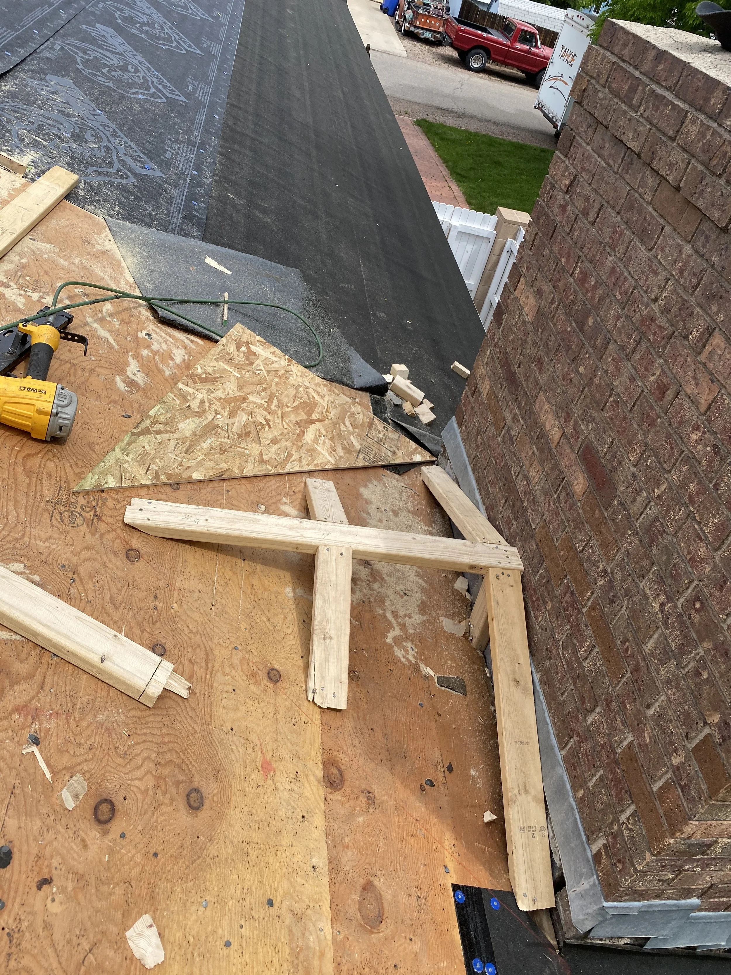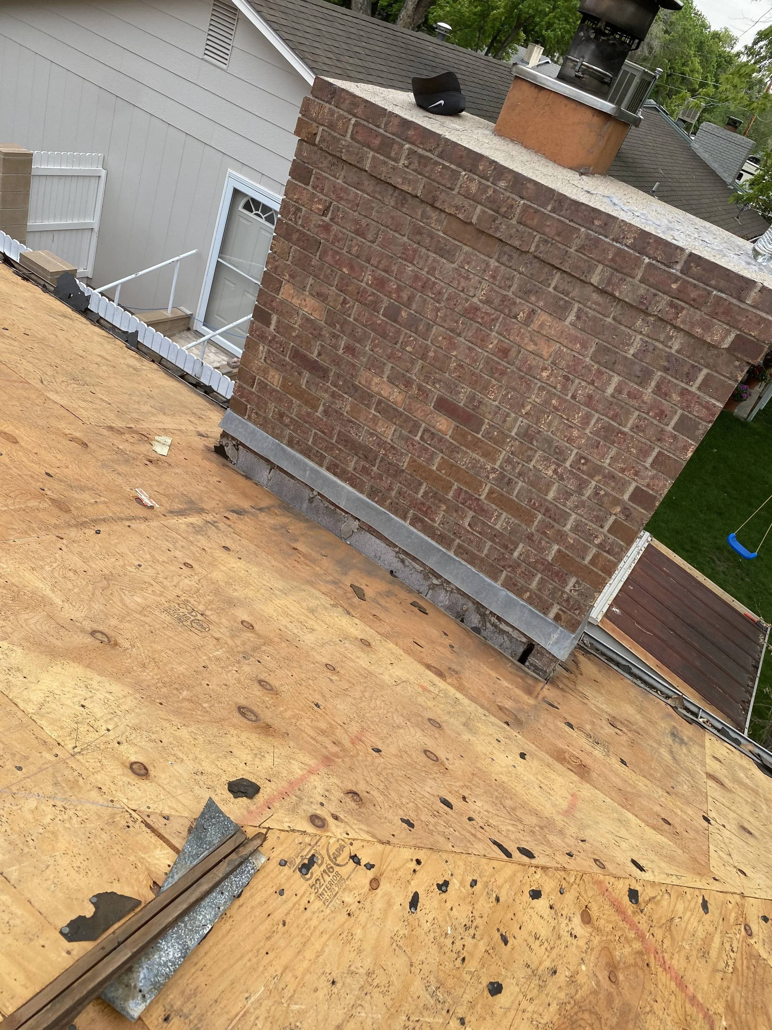 Before, during, and after photos of a chimney cricket (water diverter) installation. This custom cricket now redirects water away from the chimney, preventing leaks and protecting the roof for years to come.